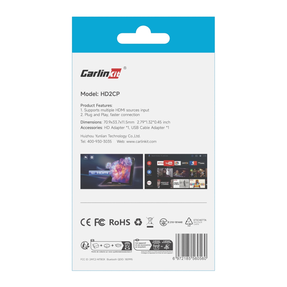 Carlinkit HD2CP es fácil de instalar y compatible con casi cualquier monitor externo que tiene un puerto HDMI, para empezar, sólo tiene que conectarlo al puerto HDMI de su TV sticks, y empezar a transmitir.