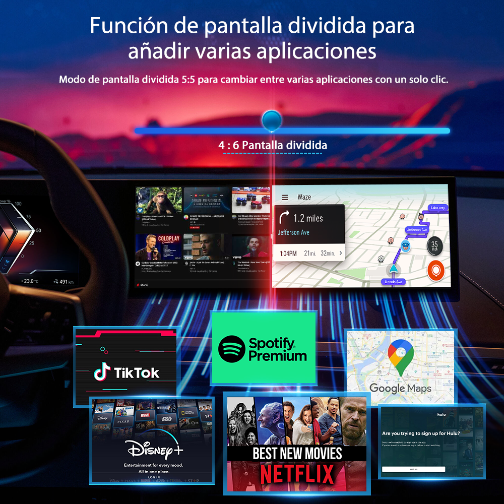 - Opciones de entretenimiento: Transmite vídeos, escucha música e incluso juega directamente desde el salpicadero.